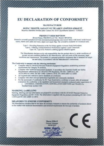 Výrobek spadá do kategorie III a odpovídá standardu ochranného oděvu proti prachovým částicím a určitým postřikům kapalnými chemikáliemi.
