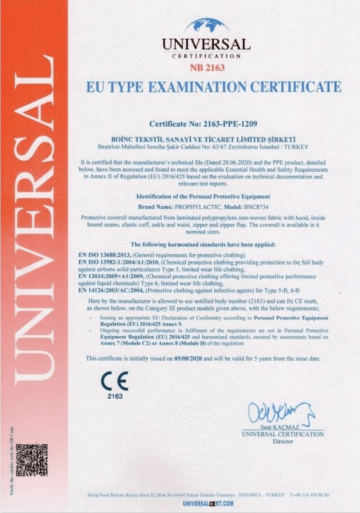 Ochranný oblek s kapucí kategorie T5 A T6 splňuje požadavky normy ISO 13485: 2016 vztahující se k způsobilosti poskytovat zdravotnické prostředky a související služby tak, že důsledně plní požadavky zákazníka a použitelné regulační požadavky.