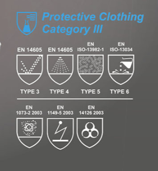 Výrobek spadá do kategorie III a odpovídá standardu ochranného oděvu proti prachovým částicím a určitým postřikům kapalnými chemikáliemi.