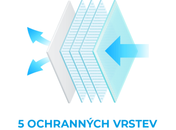 - Odfiltrování až 95% pevných částic vdechovaného vzduchu