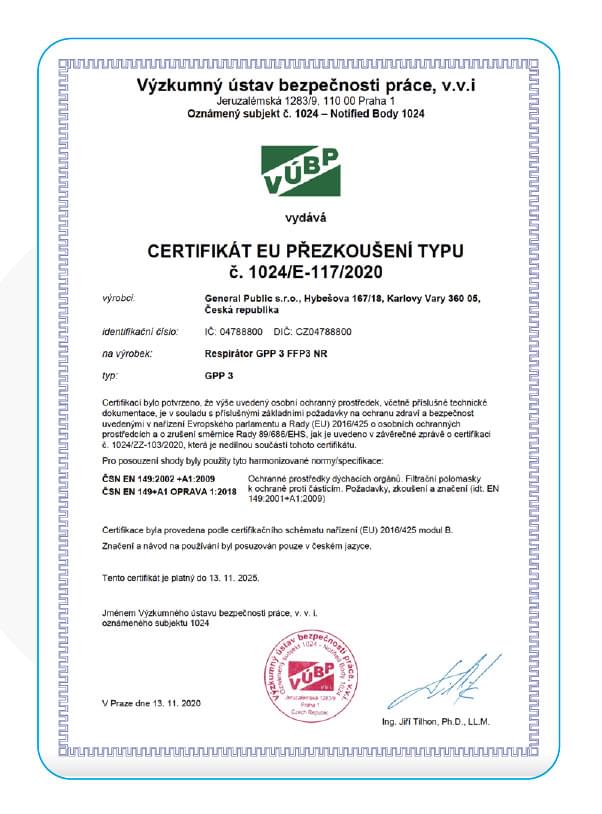 ČESKÝ Respirátor General Public třídy FFP3 s CE a EN certif.