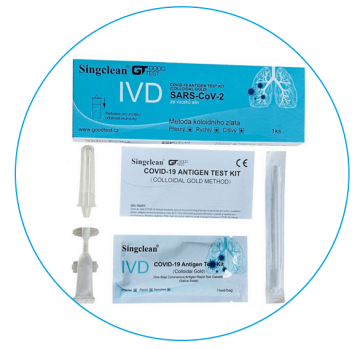 Testovací sada COVID-19 (Metoda koloidního zlata) je imunochromatografický test na koloidní zlato. Test používá protilátku COVID-19 (SARS-CoV-2) (testovací linie T) a protilátku IgG (kontrolní linie C) imobilizované na nitrocelulózovém proužku. Vínově zbarvená konjugovaná podložka obsahuje koloidní zlato konjugované s jinou COVID-19 (SARS-CoV-2) protilátkou konjugovanou s koloidním zlatem a myšími IgG-zlatými konjugáty. Když se do jamky na vzorek přidá zpracovaný pufr obsahující vzorek, spojí se COVID-19 (SARS-CoV-2) s konjugátem protilátky COVID-19 a vznikne komplex antigenu. Tento komplex migruje nitrocelulózovou membránou kapilárním působením. Když se komplex setká s linií protilátky COVID-19 testovací linie T, komplex se zachytí a vytvoří vínově zbarvený proužek, který potvrzuje výsledek reaktivního testu. Absence barevného pruhu v testovací oblasti značí nereaktivní výsledek testu. Test obsahuje vnitřní kontrolu (pás C), která by měla vykazovat vínově zbarvený proužek konjugátu bez ohledu na vývoj barvy na kterémkoli z testovacích proužků. Jinak je výsledek testu neplatný a vzorek musí být znovu otestován novou sadou.